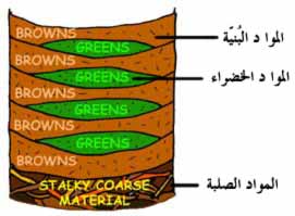 3. إن الطريقة المثلى لملىء الوعاء هي تقسيم محتواه إلى طبقات متراصفة فوق بعضها - كما يظهر في الرسم الأول. الطبقة التي تكون مكونة من مواد خضراء يليها طبقة المواد البنّية وهكذا … هناك حكمة من وراء إتباع هذه الطريقة لكنه لا يسعنا شرحها بأكملها, ولكن بإختصار هذه الطريقة تسمح بتهوية المواد الموجودة في الوعاء و تساعد في تصريف المياه من الوعاء – والتي عادة ما تكون مخزنة في أوراق الأشجاء و الأطعمة …